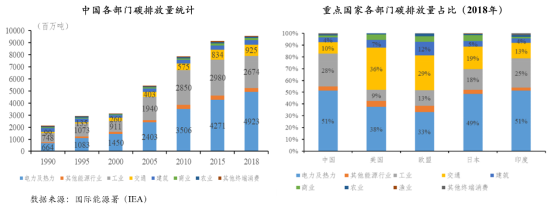 根據(jù)國(guó)際能源署的統(tǒng)計(jì),我國(guó)碳排放最多的是能源部門,占比在50%以上,其次為工業(yè)、交通和建筑,占比分別為28%、10%和4%。