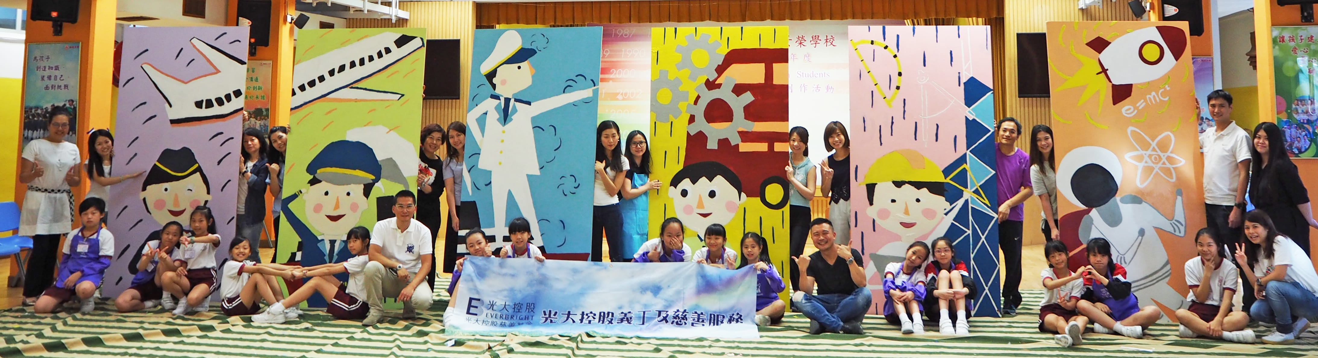 在本次活動中,光大控股義工隊與接近20名9至11歲的學生一起進行壁畫創(chuàng)作活動?;顒釉趯煄ьI下,講解壁畫制作的技巧后,學生及義工們便以大約兩小時合力完成以「職業(yè)」為主題的六幅壁畫。