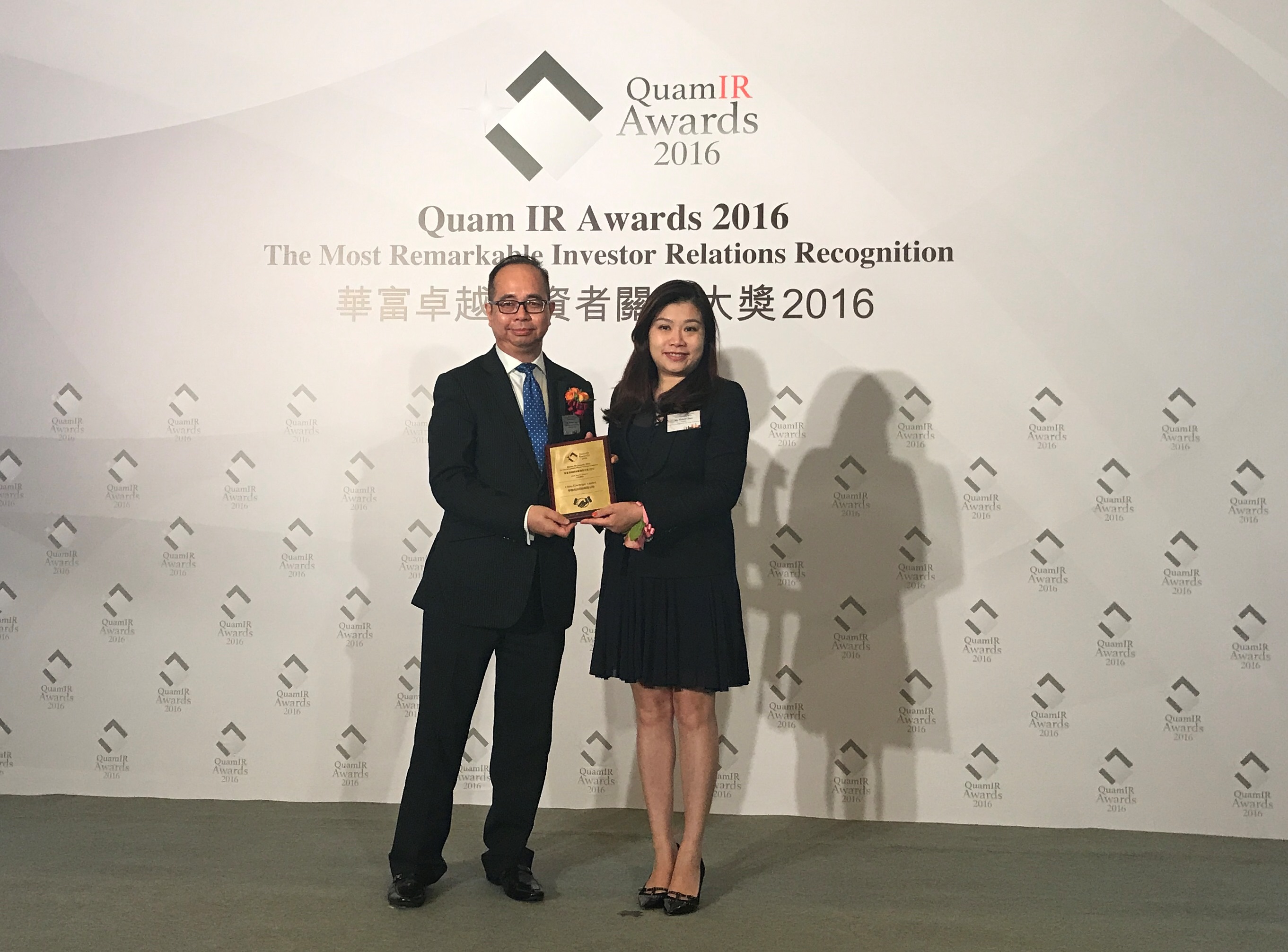 “Quam IR Awards” aims to honour models of practice and leadership in Investor Relations among the listed companies in the Asia Pacific region. The winners have been devoted in upholding transparent communications between companies and stakeholders in the past year. The Award serves as the well-recognized testimonials to the winners’ excellence, which can help bring accreditation and prestige to the winning companies and their remarkable achievement in the area of IR among shareholders, institutional investors, equity research analysts and financial media.