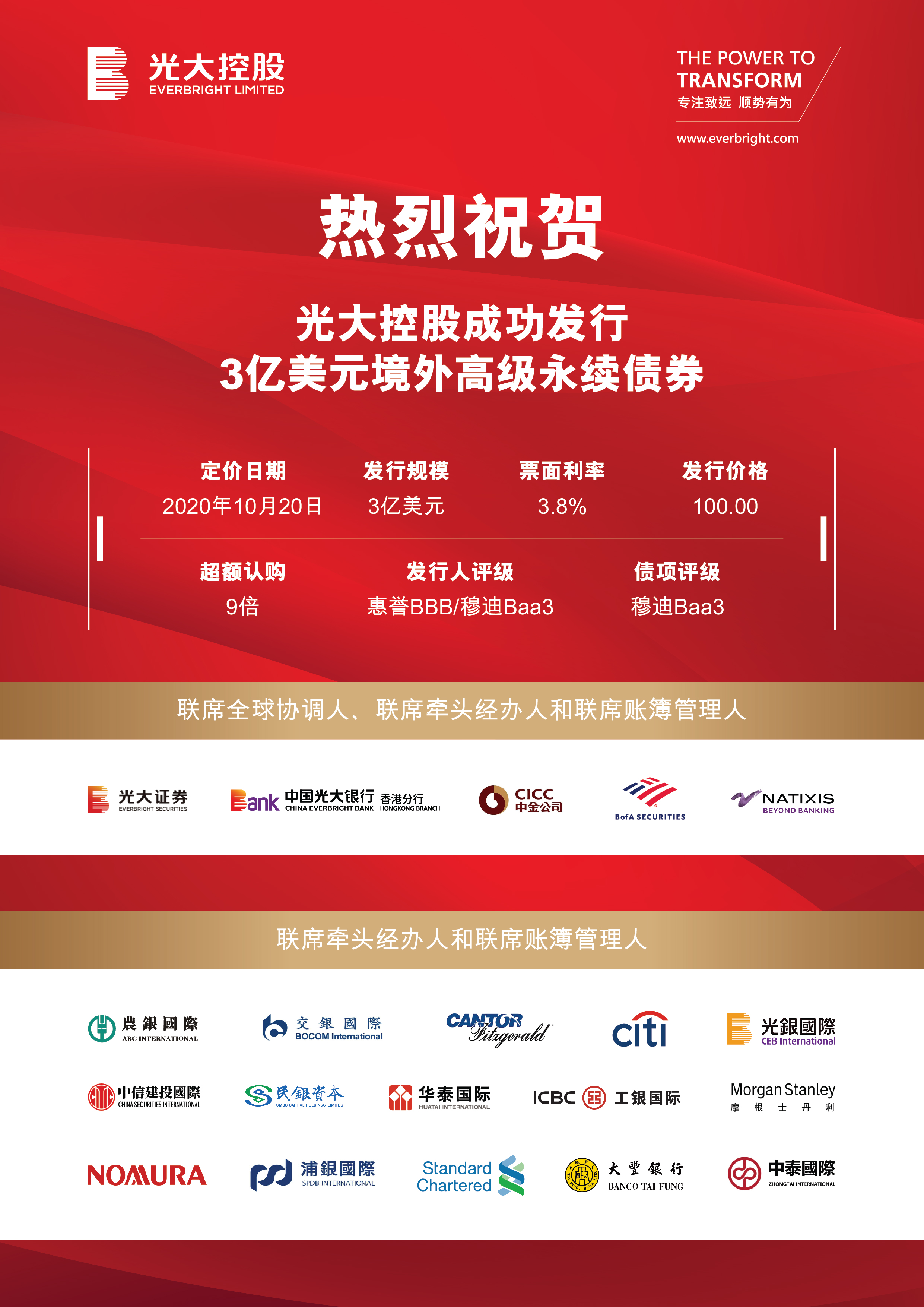 20 October 2020 – Everbright successfully issued USD 300 million of offshore senior perpetual capital securities with a coupon rate of 3.8%. The capital raised will be used for offshore debt refinancing, offshore asset management business development and supplementary operational capital. The issuance was Everbright’s first debut in the offshore capital market. It has been highly recognized by investors, reaching a number of benchmarks in the capital market.