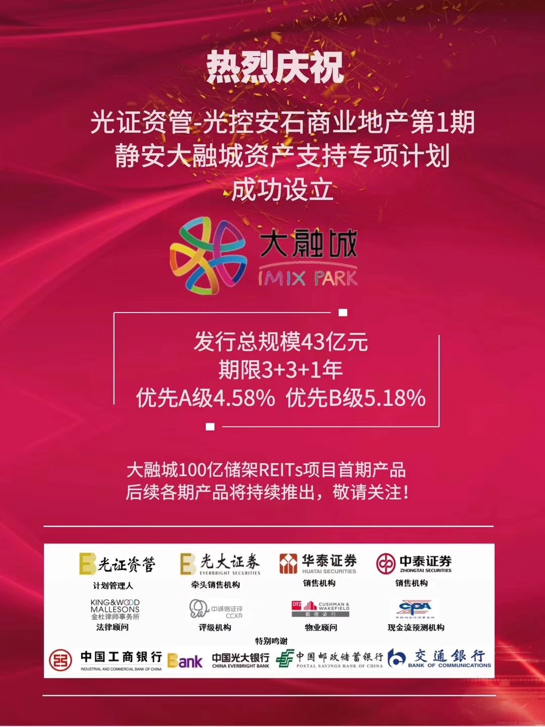 The launching of Jing’An IMIX REIT-like product also represents a typical example of the efficient and integrated cooperation amongst member institutions within Everbright Group. EBA Investments, being the organizer of the product, is the exclusive real estate investment and management platform under Everbright. Its outstanding competence in asset securitization business ensured the effective design, successful establishment and well-going launch of the product. Everbright Securities Asset Management, being the product’s manager, is an asset management platform under Everbright and an award-winning and leading figure in asset management market in investment banking industry. Everbright Jiabao, being the product’s credit enhancing party and preemptive right holder, is one of CEL’s member institutions and the only domestically-listed company that is principally engaged in real estate asset management. Everbright Securities, being the leading sales institution, is a comprehensive and second-to-none financial service provider under Everbright which enjoys remarkable market reputation. Everbright Bank, being one of the subscribers of Senior units of the product, drives the financial innovations while controlling risks at a manageable level.
