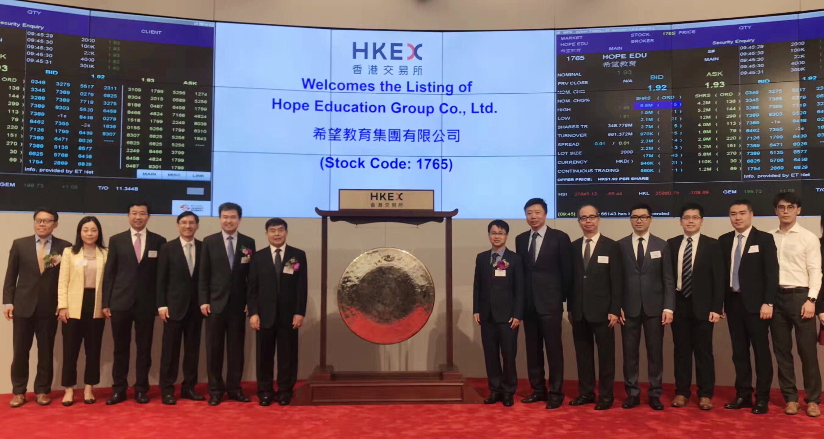 3 August 2018, China Everbright Limited (“Everbright”, stock code: 165.HK) is pleased to announce that its portfolio company Hope Education Group Co., Ltd (“Hope Education”), a leading domestic higher education group, is officially listed on the main board of HKEX today with its stock code 1765.HK. After the listing, Everbright, through its various controlled corporations, is deemed to be interested in approximately 12.79% shareholding of Hope Education (assuming the over-allotment option is not exercised).. This IPO project becomes another successful investment case of Everbright.