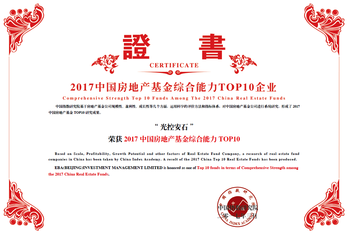 EBA Investments was ranked among China’s Top 10 real estate funds in terms of comprehensive strength in 2017.