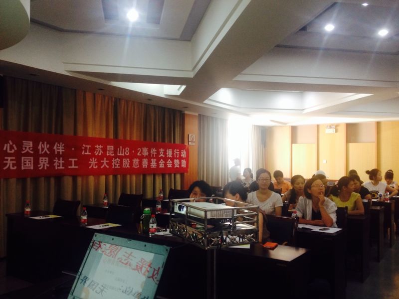 On 2 August 2014, an explosion caused by dust killed 71 people and injured nearly 200 in Kunshan, Jiangsu. Immediately after the incident, Social Workers Across Borders provided four days of on-site training, focusing on the skills required for emergency intervention, admission visits, companionship, grief counselling and more. Both local government employees and members of the community actively supported and participated in the training.