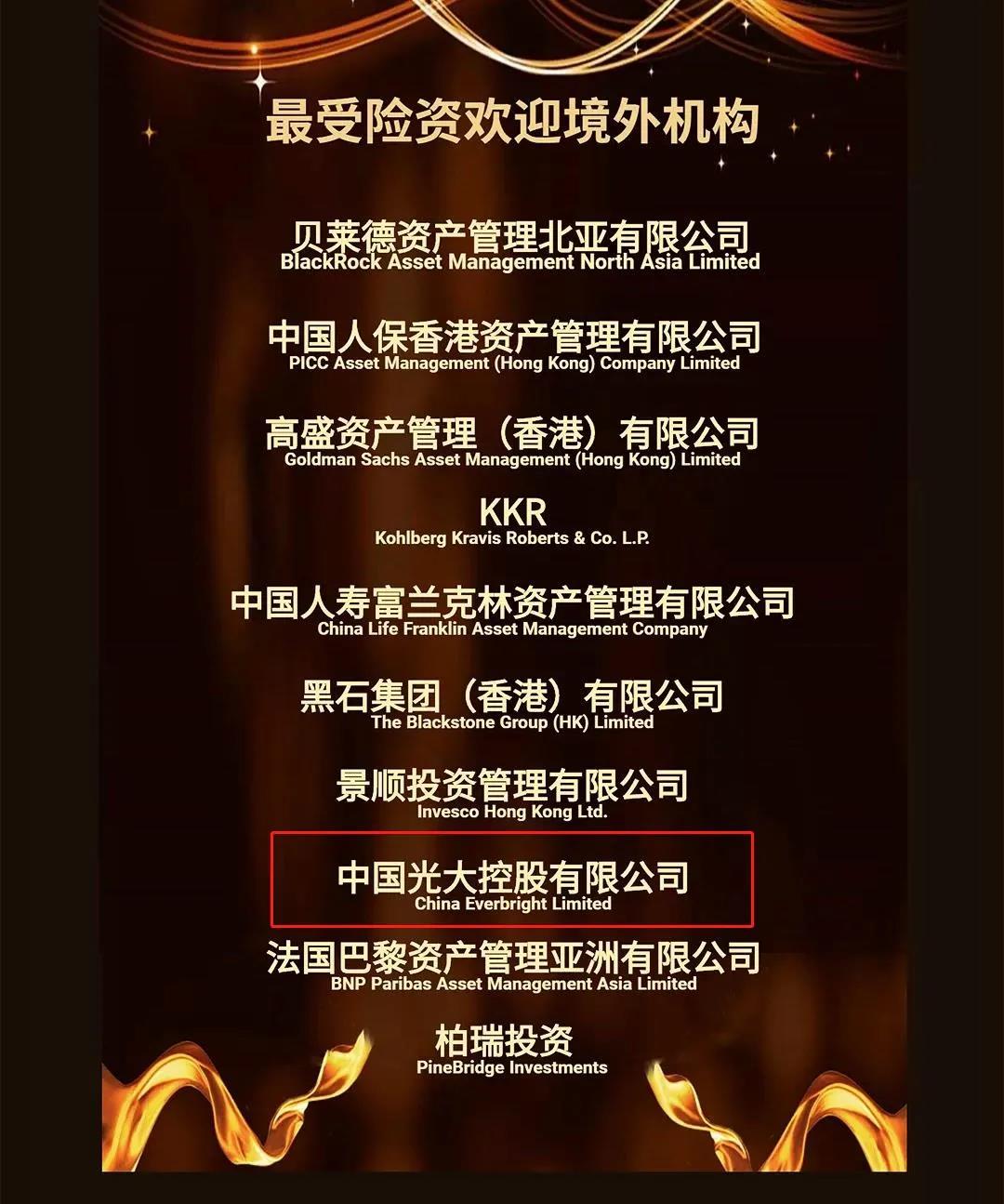 2020年7月8日,光大控股獲得中國保險資產(chǎn)管理業(yè)協(xié)會頒發(fā)「最受險資歡迎境外機(jī)構(gòu)」推介。這是協(xié)會首次舉辦的境外機(jī)構(gòu)推介,同時獲得本次推介的機(jī)構(gòu)還有貝萊德、高盛資產(chǎn)、KKR、黑石集團(tuán)(香港)等其他10家國際頂尖資產(chǎn)管理機(jī)構(gòu)。