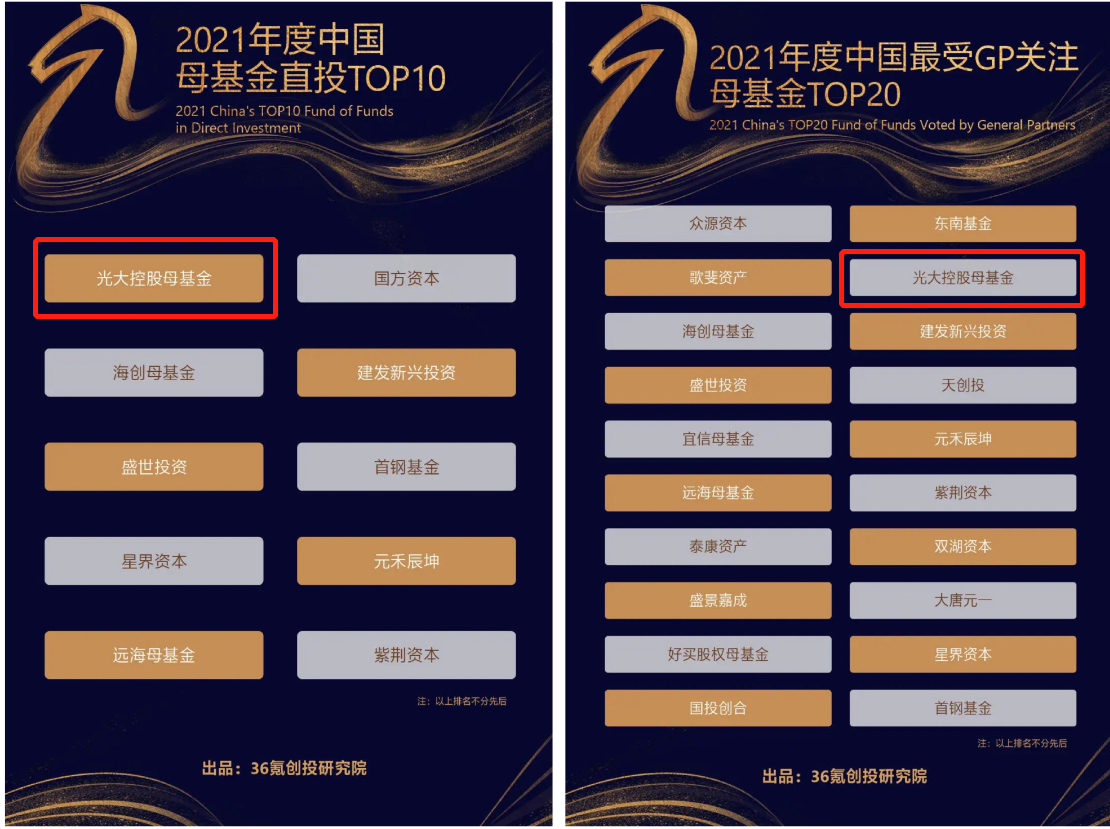 5月11日,36氪重磅發(fā)佈中國最受LP認可白馬、黑馬投資機構暨最受GP關注母基金榜單。光大控股母基金憑藉優(yōu)異的表現(xiàn)榮獲「2021年度中國母基金直投TOP10」、「2021年度中國最受GP關注母基金TOP20」二項大獎。