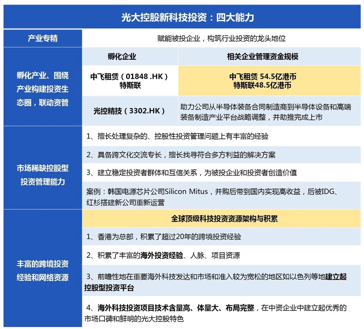 第二,孵化產(chǎn)業(yè),聯(lián)動資產(chǎn)管理的能力。光大控股歷史上成功孵化多個業(yè)務(wù)板塊,包括中飛租賃和特斯聯(lián)。同時,光大控股以產(chǎn)業(yè)聯(lián)動資產(chǎn)管理,控股的中飛租賃相關(guān)資產(chǎn)承諾管理規(guī)模54.5億港元,特斯聯(lián)相關(guān)基金承諾管理規(guī)模48.5億港元。這種擴大投資和聯(lián)動各類業(yè)務(wù)的生態(tài)協(xié)同投資能力,在中國尚為首驅(qū)。開創(chuàng)性投資孵化產(chǎn)業(yè),由產(chǎn)業(yè)再次帶動新的資管,在單一行業(yè)賽道構(gòu)築起極深的產(chǎn)業(yè)護城河並打通產(chǎn)業(yè)生態(tài)廣度,讓資管與產(chǎn)業(yè)深度融合,光大控股也從頂級科技捕手逐漸裂變?yōu)榭萍籍a(chǎn)業(yè)帝國鑄造者。