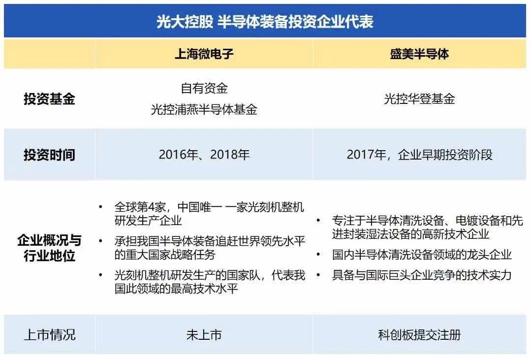 在上游半導體裝備領(lǐng)域,光大控股佈局了精密矽片處理設(shè)備和晶圓清洗設(shè)備的相關(guān)企業(yè),較大體量部署了中國唯一一家光刻機整機研發(fā)生產(chǎn)企業(yè)——上海微電子,其承擔了我國半導體裝備追趕世界領(lǐng)先水準的重大國家戰(zhàn)略任務(wù)。並控股了做半導體設(shè)備整機代工的光控精技,同時投資了國內(nèi)半導體清洗設(shè)備領(lǐng)域的龍頭企業(yè)盛美半導體,形成垂直產(chǎn)業(yè)鏈。