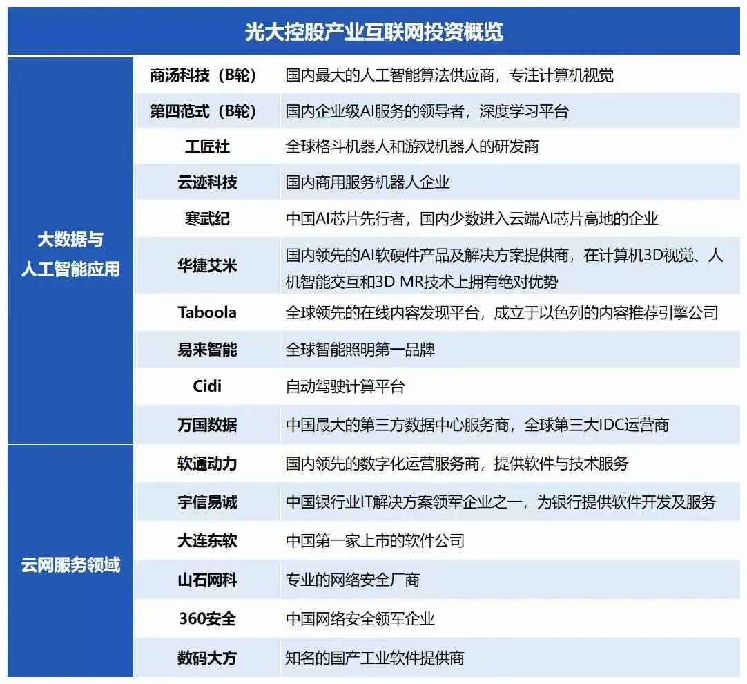 除了半導體領(lǐng)域,在產(chǎn)業(yè)物聯(lián)網(wǎng)領(lǐng)域,光大控股對大數(shù)據(jù)與人工智能、雲(yún)網(wǎng)服務(wù)兩大領(lǐng)域也進行了深度佈局。在大數(shù)據(jù)與人工智能領(lǐng)域,2016年投資了商湯科技(B輪);2017年投資第四範式(B輪),而後投資了兩家交互式機器人企業(yè)工匠社和雲(yún)跡科技。期間,還投資了AI芯片設(shè)計的公司寒武紀,以及專注虛擬實境的華捷艾米,人工智能廣告推送企業(yè)Taboola等;在雲(yún)網(wǎng)服務(wù)領(lǐng)域,光控投資了數(shù)家光通信、雲(yún)測試和人工智能數(shù)據(jù)標注軟通動力、宇信易誠,大連東軟等多家軟體外包商,山石網(wǎng)科和360安全兩家信息安全產(chǎn)品及解決方案提供商,還包括國內(nèi)知名的國產(chǎn)工業(yè)軟體提供商數(shù)碼大方等。