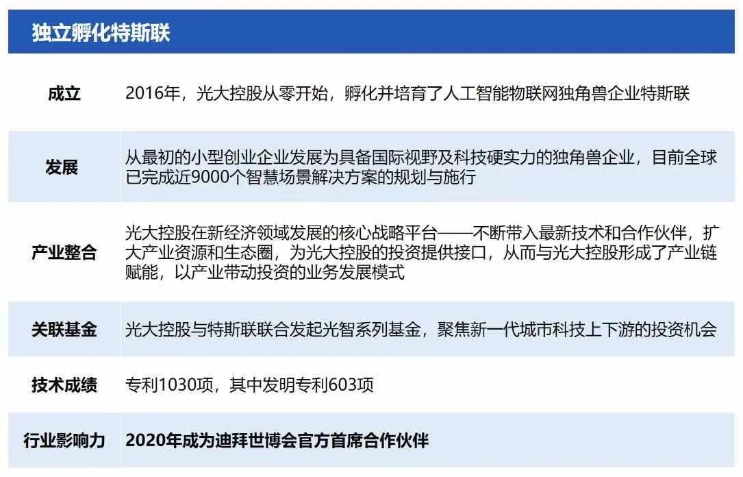 除了投資外,在產(chǎn)業(yè)互聯(lián)網(wǎng)領(lǐng)域,光大控股投資並孵化屬於自己的人工智能物聯(lián)網(wǎng)獨角獸企業(yè)特斯聯(lián)。