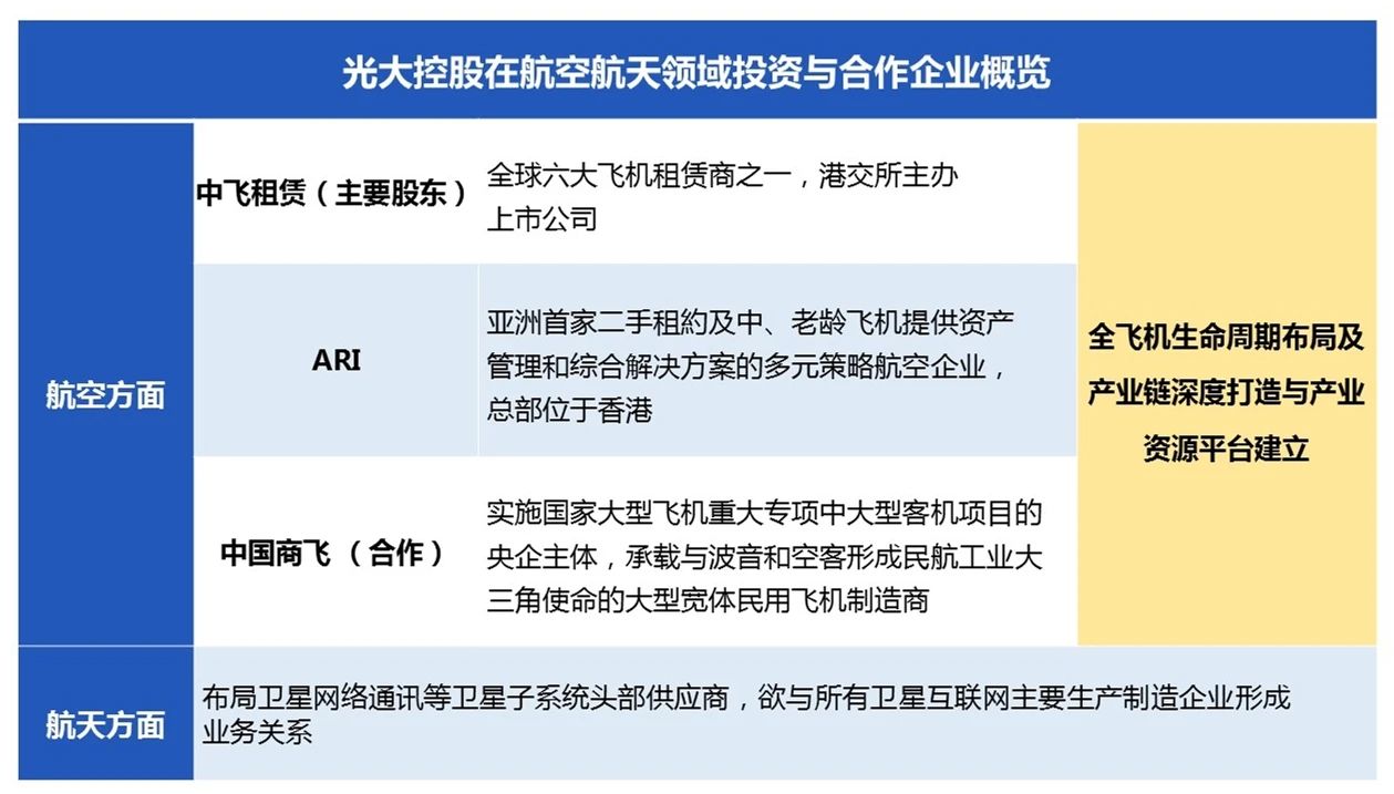 在航空方面,光大控股2011年入股中國飛機租賃,成為主要股東,投後幫助其發(fā)展和業(yè)務(wù)開拓,並推動了香港飛機租賃稅制的修訂。至2020年末,中飛租賃機隊數(shù)量從10架成長到128架,目前,中飛租賃正逐步打通後飛機拆解產(chǎn)業(yè)鏈、投資佈局飛機拆解公司ARI,和開發(fā)後飛機市場的區(qū)塊鏈。航太方面,光大控股已佈局衛(wèi)星網(wǎng)路通訊等衛(wèi)星子系統(tǒng)供應(yīng)商。未來計畫以此為突破口,與衛(wèi)星互聯(lián)網(wǎng)計畫主要生產(chǎn)製造企業(yè)形成業(yè)務(wù)關(guān)係與產(chǎn)業(yè)鏈。