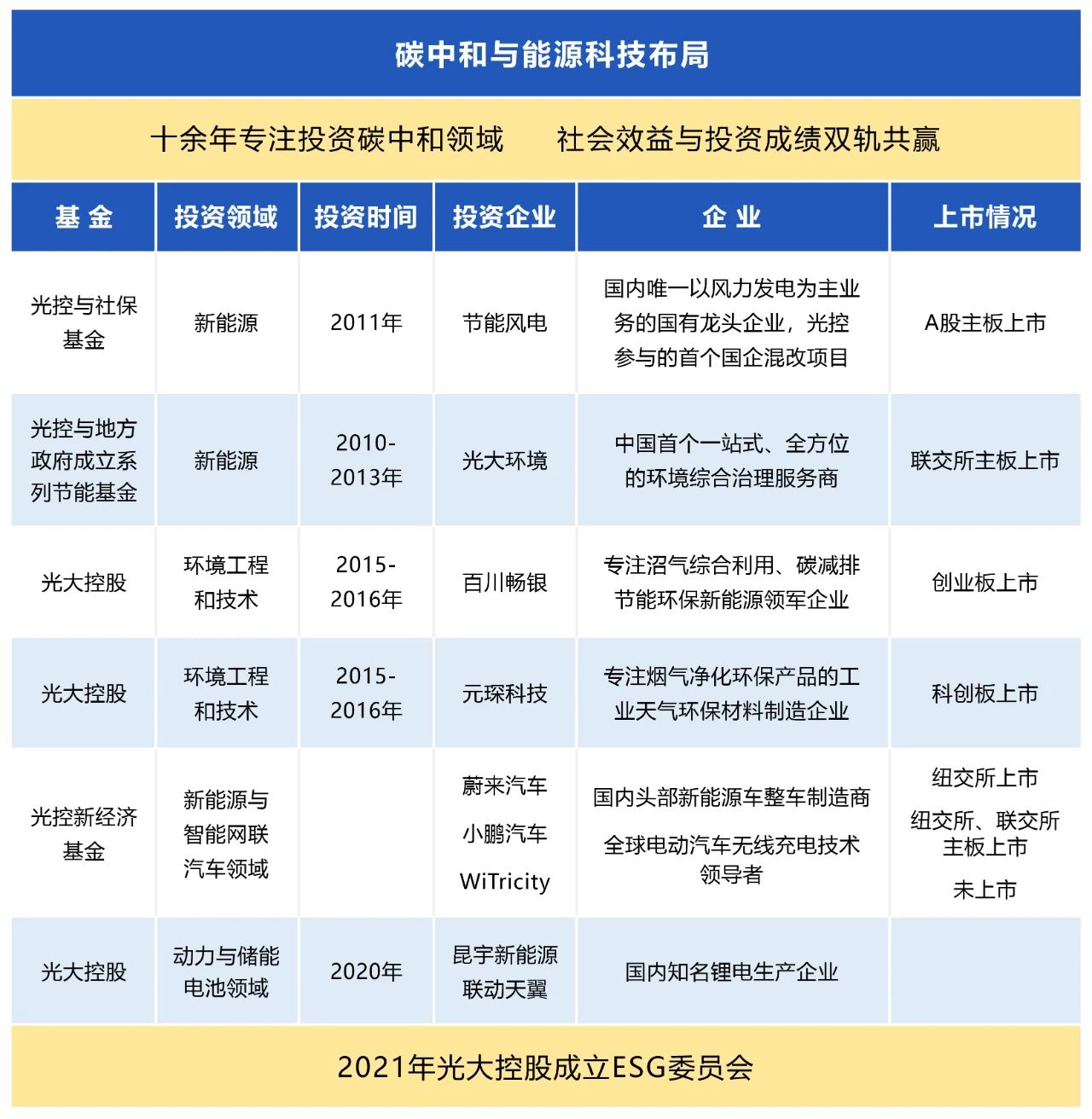 在新能源領(lǐng)域,光大控股自2006年投資金風科技實現(xiàn)了較好的長期投資效益。2011年,光大控股和社?;鸬嚷?lián)合投資了節(jié)能風電。往後數(shù)年,隨著光伏降本速度加快,光大控股於2017年投資了國內(nèi)領(lǐng)先光伏組件製造企業(yè)海泰新能。新能源與智能網(wǎng)聯(lián)汽車領(lǐng)域,光大控股投資了蔚來汽車和小鵬汽車,並在後市場領(lǐng)域佈局了全自動倉儲式機械車庫製造和運營商中泰停車,和美國領(lǐng)先的無線充電技術(shù)公司W(wǎng)iTricity。在動力與儲能電池領(lǐng)域,2020年末至今,光大控股先後完成了對國內(nèi)兩家知名鋰電生產(chǎn)企業(yè)昆宇新能源和聯(lián)動天翼的股權(quán)投資。此外,2010-2013年間,光大控股還和地方政府成立了一系列節(jié)能、低碳基金,陸續(xù)投資了光大環(huán)境等多家環(huán)境工程和技術(shù)公司。2021年,秉承長期可持續(xù)的發(fā)展理念,光大控股在董事會成立了ESG委員會,將ESG理念全面貫徹到公司的治理和投資中。