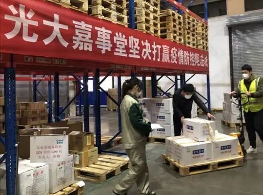▲光大嘉事堂物流工作人員搶運搶發(fā)政府疫情防控物資