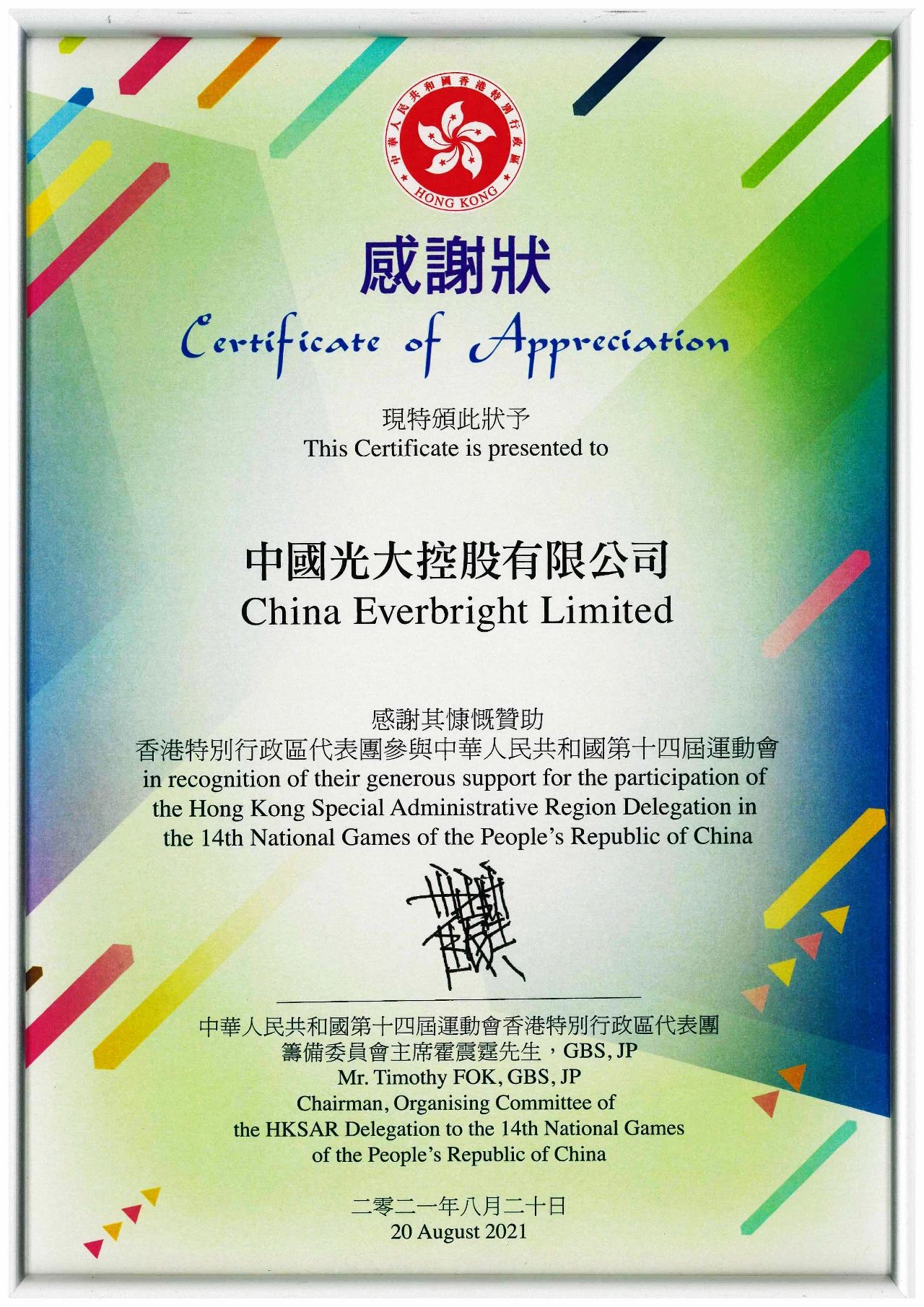 8月20日,第十四屆全運會香港特區(qū)代表團(“代表團”)舉行授旗儀式。儀式上,代表團籌備委員會為光大控股頒發(fā)感謝狀,感謝光大控股慷慨贊助,助力代表團體育健兒參賽,支持香港體育發(fā)展。